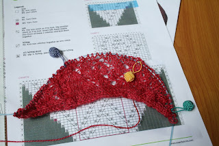 Arashi, you had me at hello, when I opened the envelope and saw the red I was smitten. It is as if this company has designed their kits and colorways just for me. This is a larger shawl and will therefore take me longer than the first one, do you think I can have it off the needles in time for the next shipment? The whole pattern is so much different than anything I have knit before that I don't know what kind of progress goals to set. I will commit to picking it up and knitting a bit every day, but when those rows get to be 512 stitches long I have no idea how much that will slow me down. It will grow to a whooping 630 stitches in total.